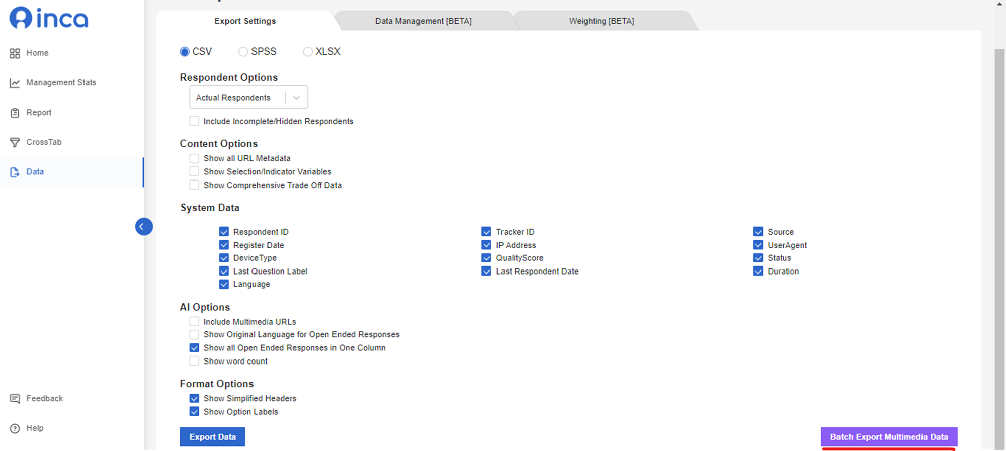 To download the audio and video files, go to the Dashboard, and on the Data page, click Batch Export Multimedia Data. Users will be able to download a zip file containing all the multimedia inputs (Audio, Video, Photos) from participants for all the open-ended questions.